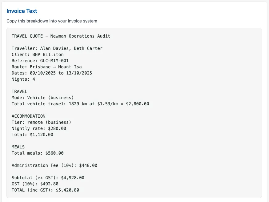 QuoteWise also produces a clean, copy-friendly travel breakdown you can paste directly into your invoicing system.