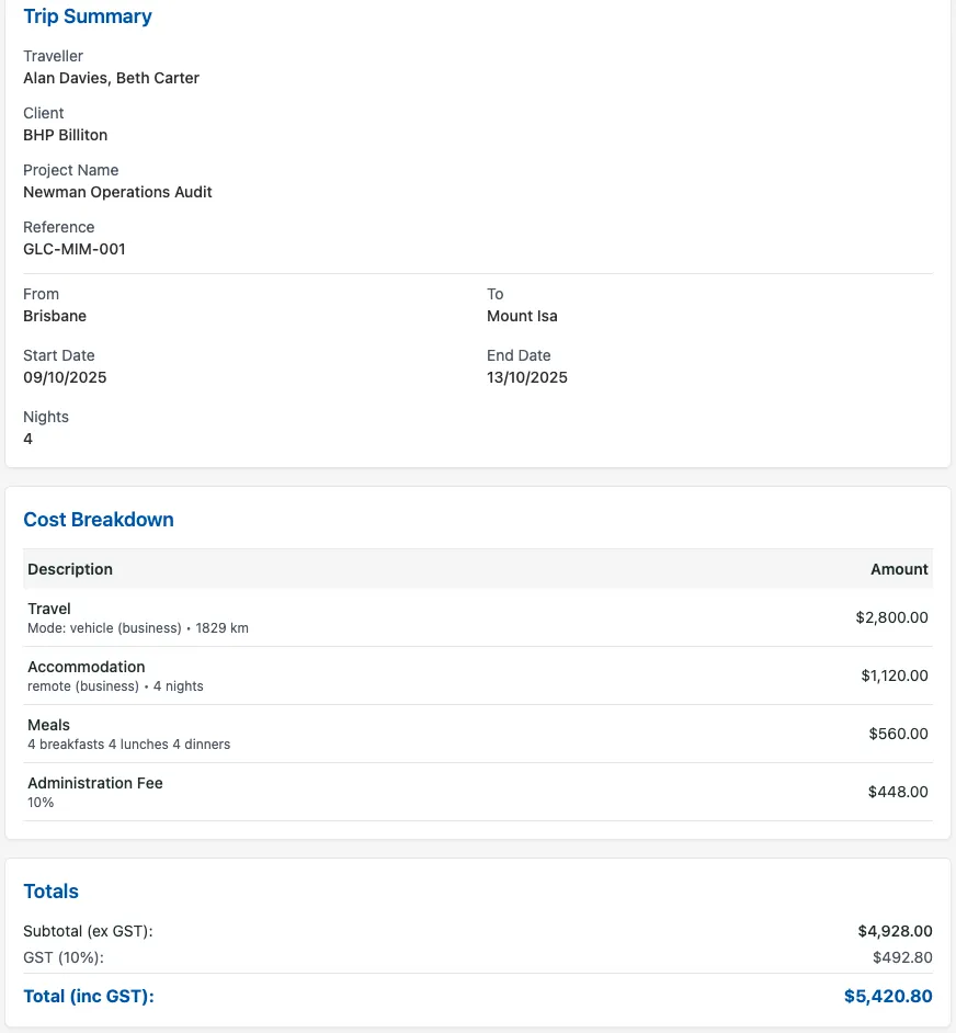 QuoteWise helps Australian businesses calculate, structure, and present travel costs clearly and consistently, so your quotes are easier to prepare, easier to explain, and easier to approve.